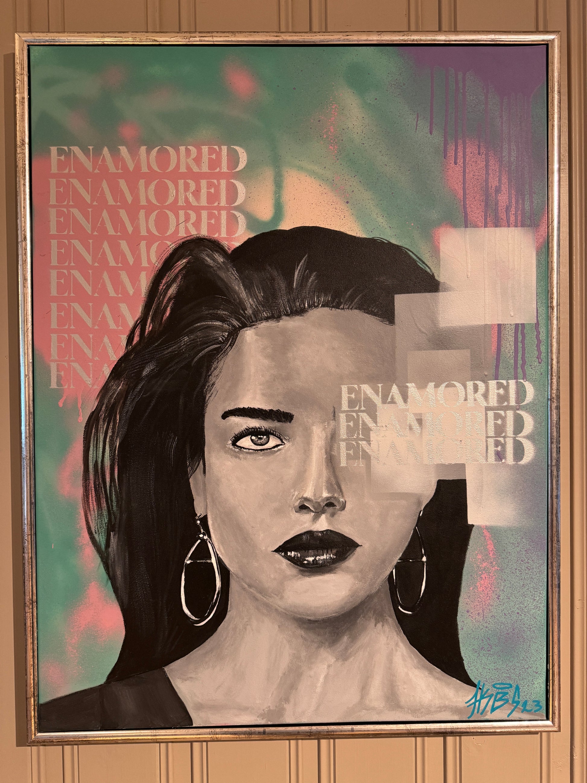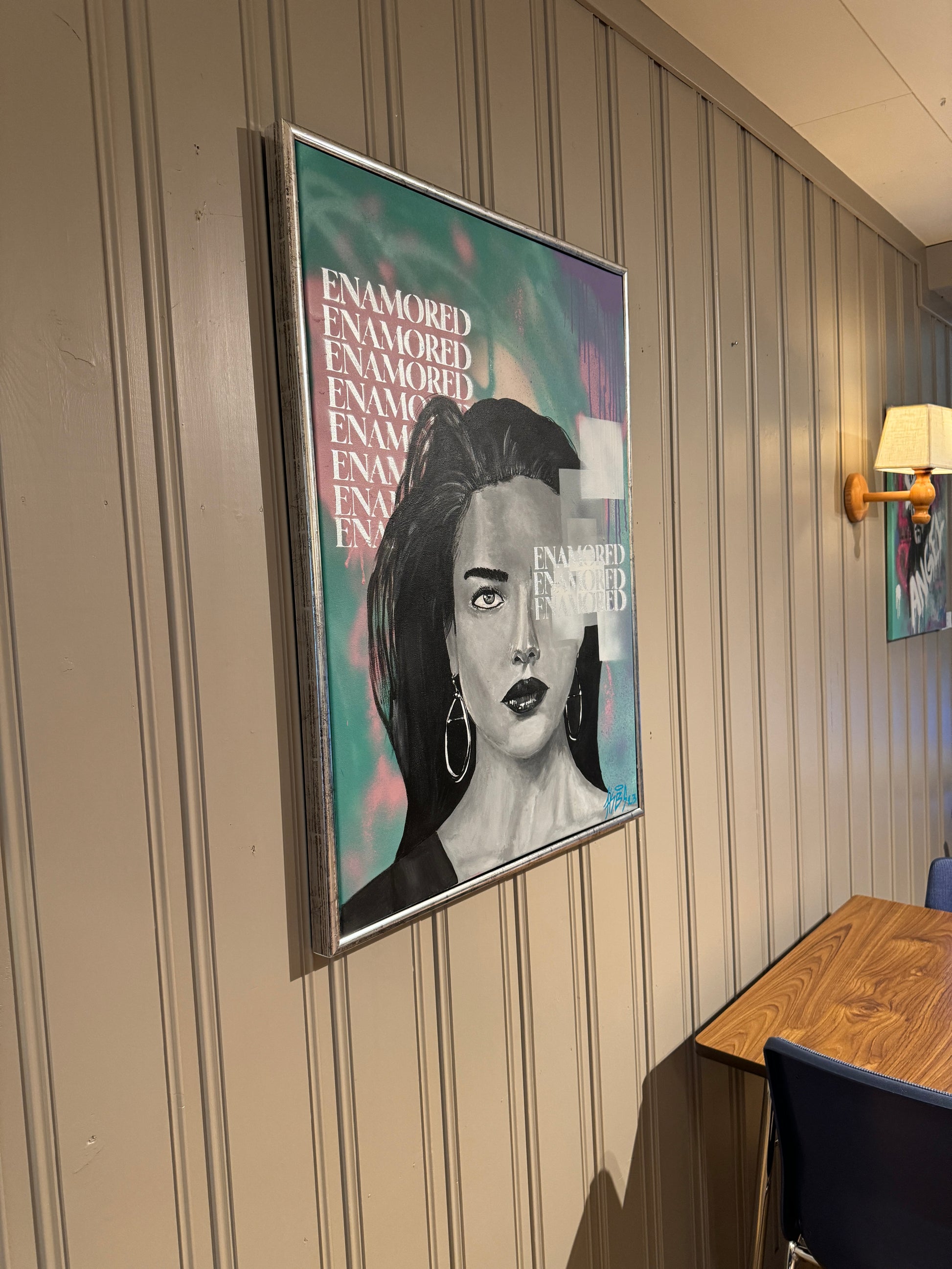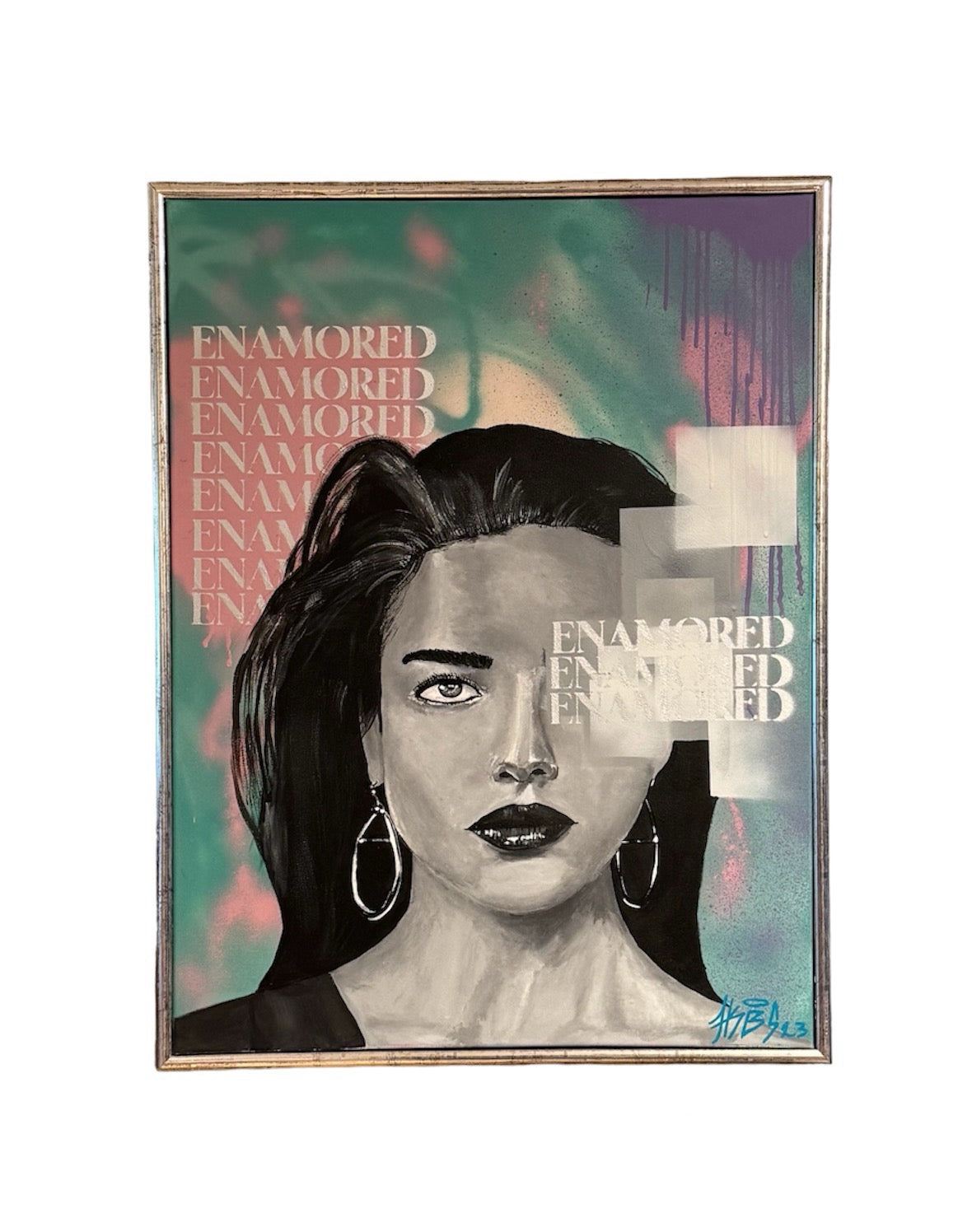 «Enamored» 80x60cm med ramme. Svart-hvitt portrett av ukjent dame med friske bakgrunnsfarger. Enamored betyr at man beundrer eller elsker noe veldig mye.