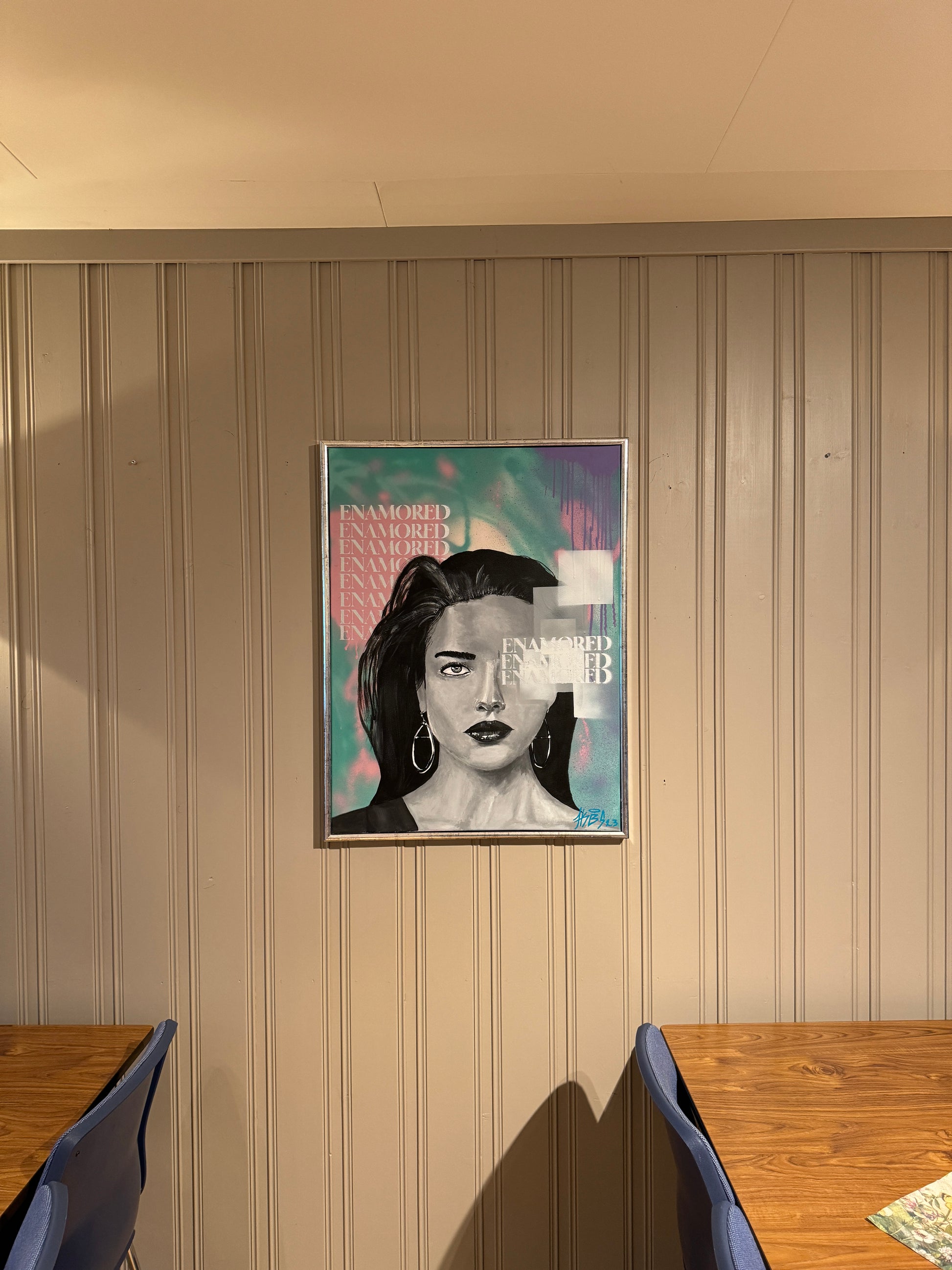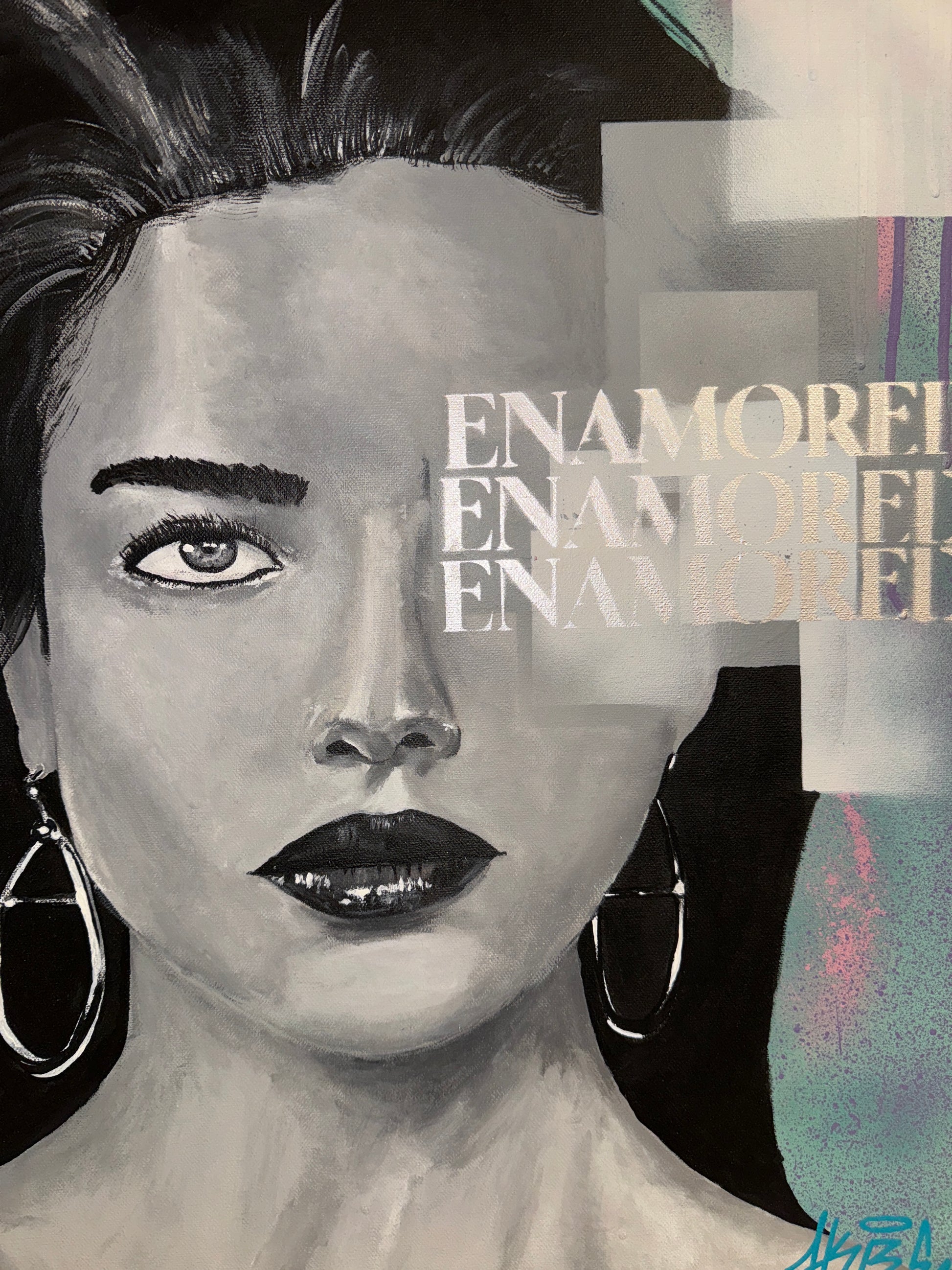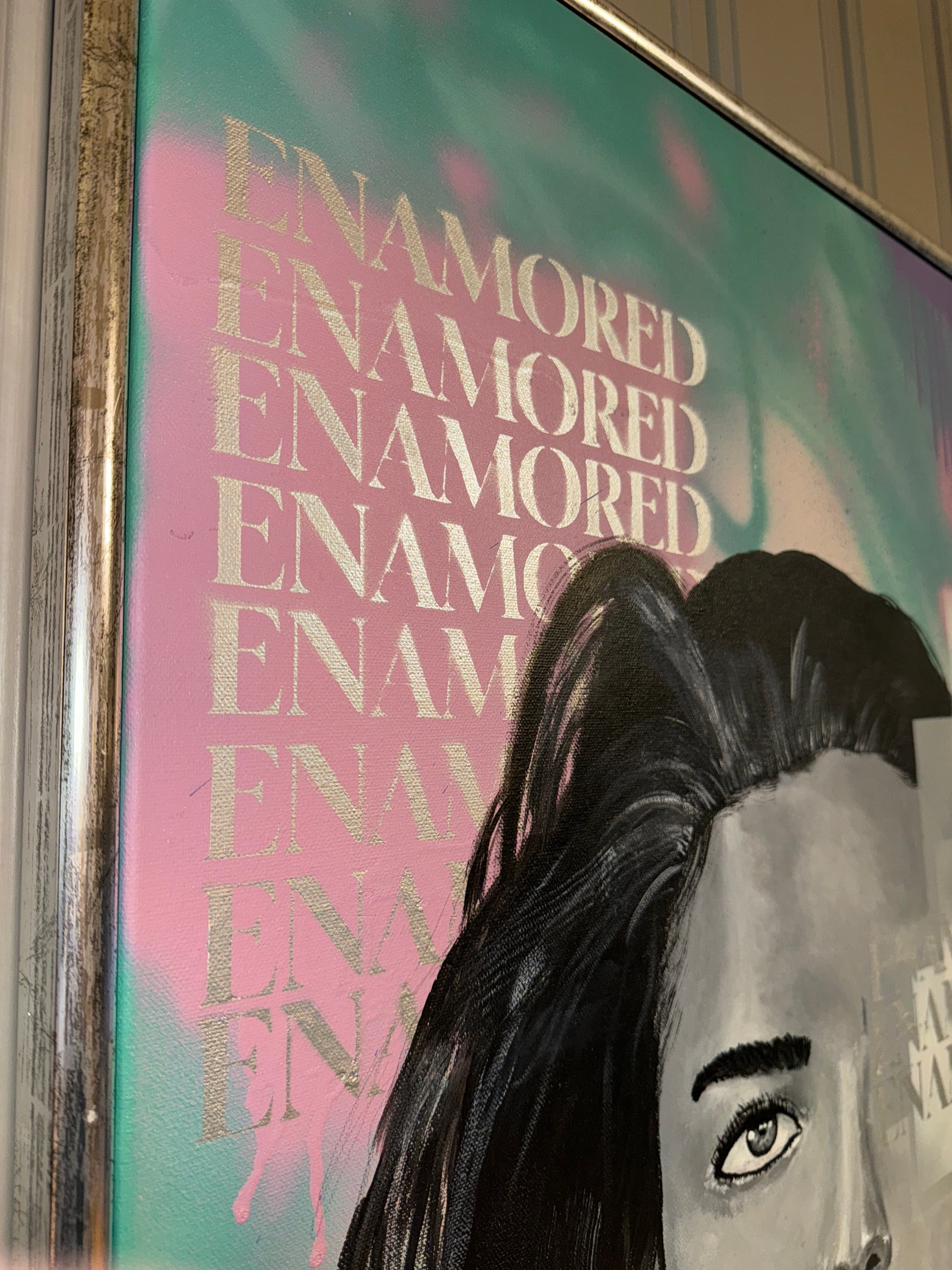 «Enamored» 80x60cm med ramme. Svart-hvitt portrett av ukjent dame med friske bakgrunnsfarger. Enamored betyr at man beundrer eller elsker noe veldig mye.