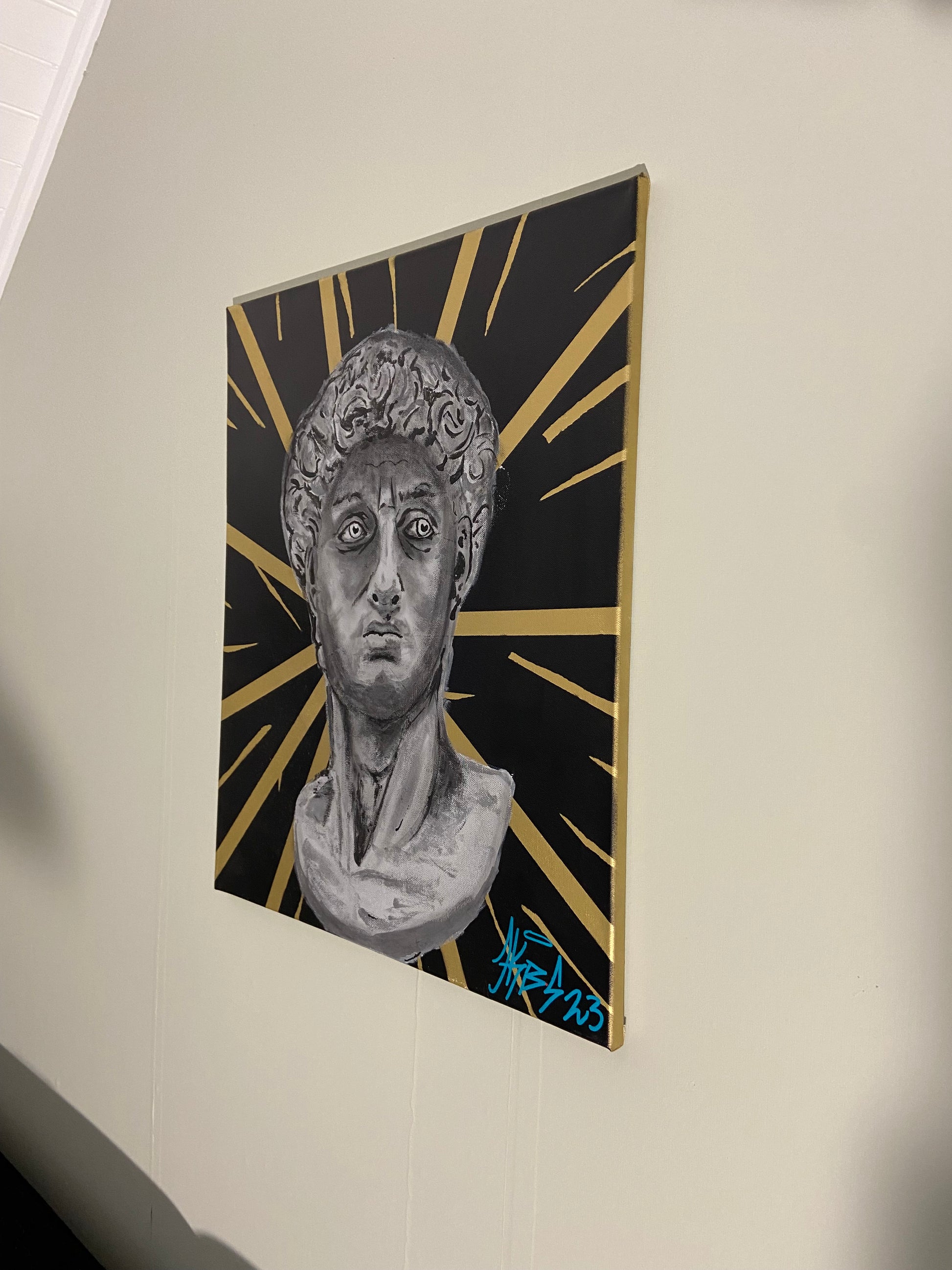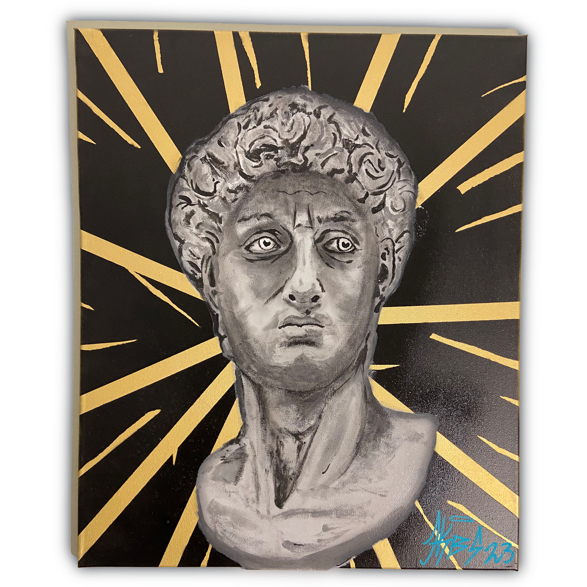 Greek gold, med gull og svart i bakgrunnen og byste av gresk statue som motiv!
