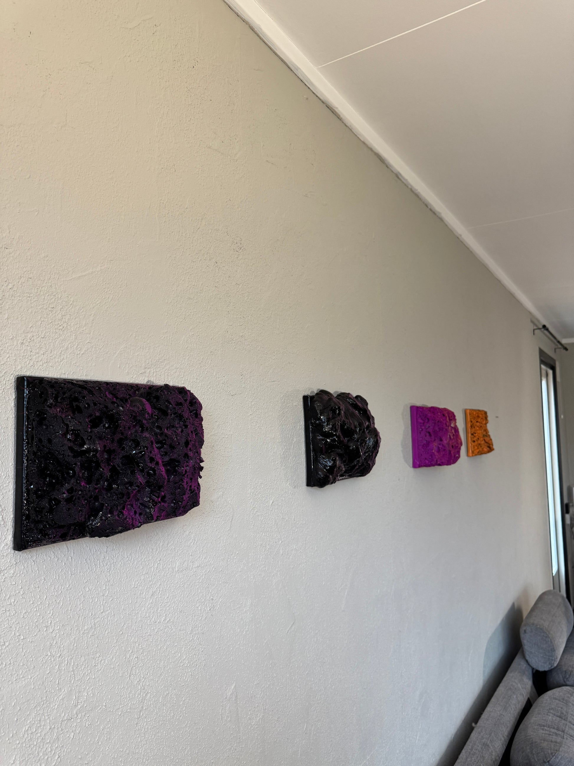 Unikt 3D bilde, som skaper farge illusjon da du ser det fra side til side. Fra en side ser det helt svart ut, og fra andre ser det lilla ut. Passer bra sammen med flere av samme type verk på veggen.