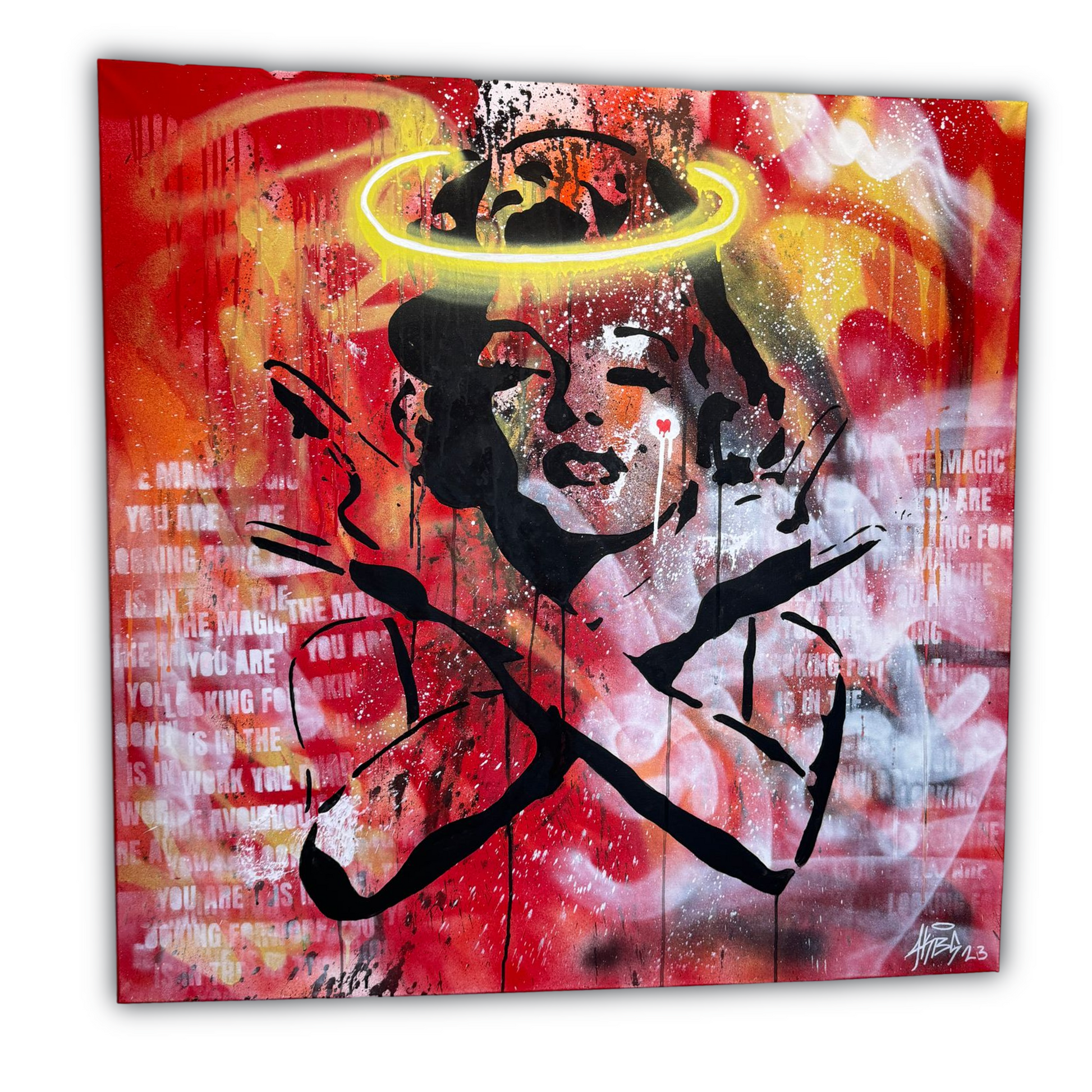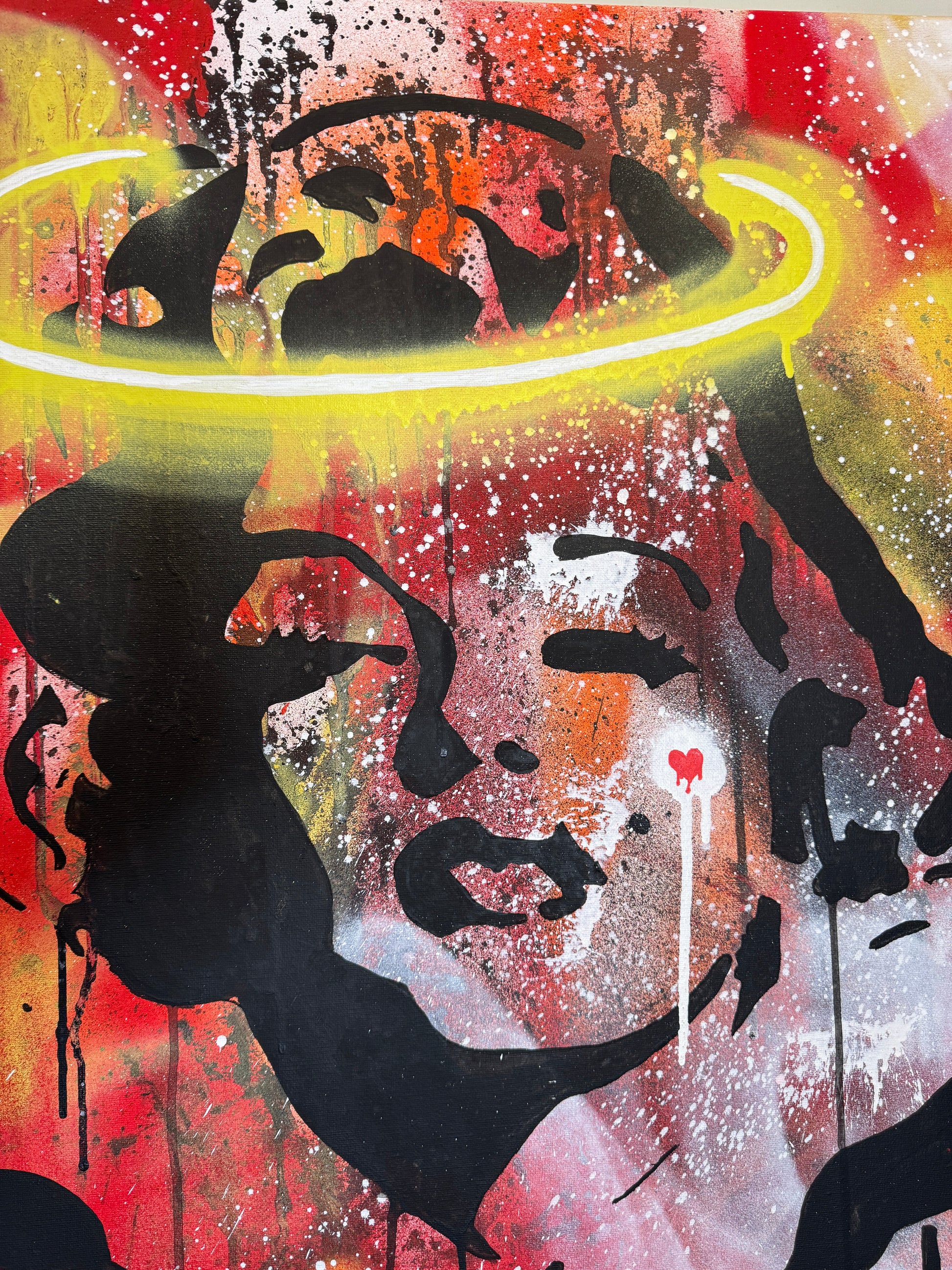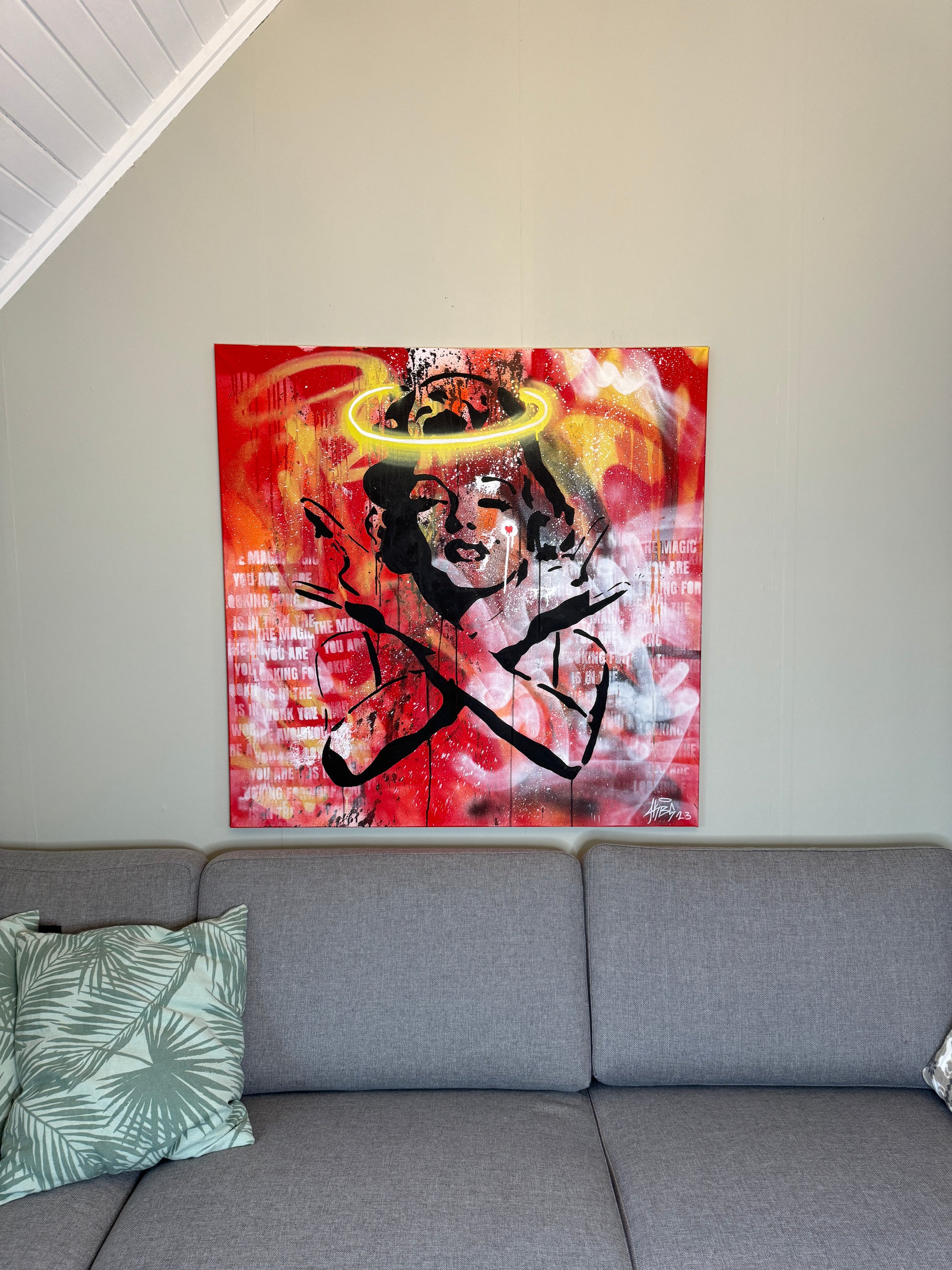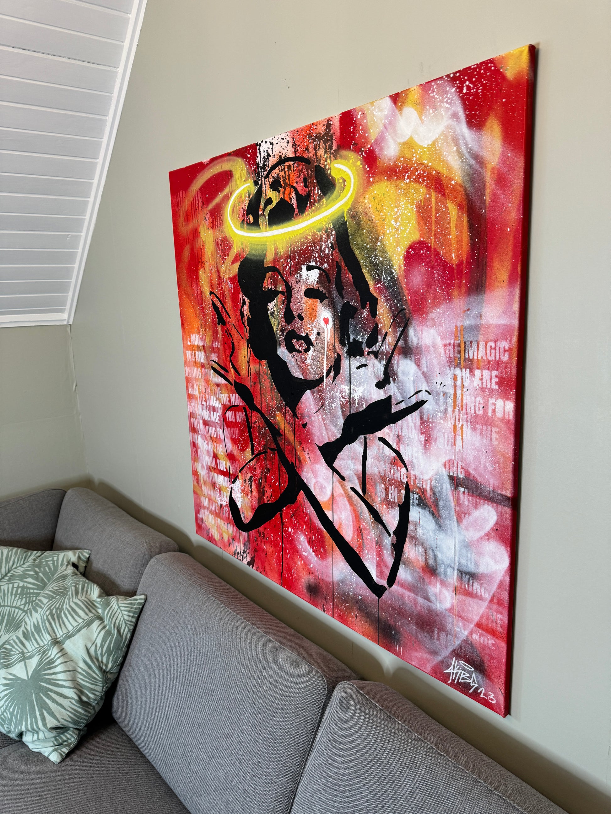 Sterke rødfarger og gul, som passer fint sammen på 100x100cm lerret