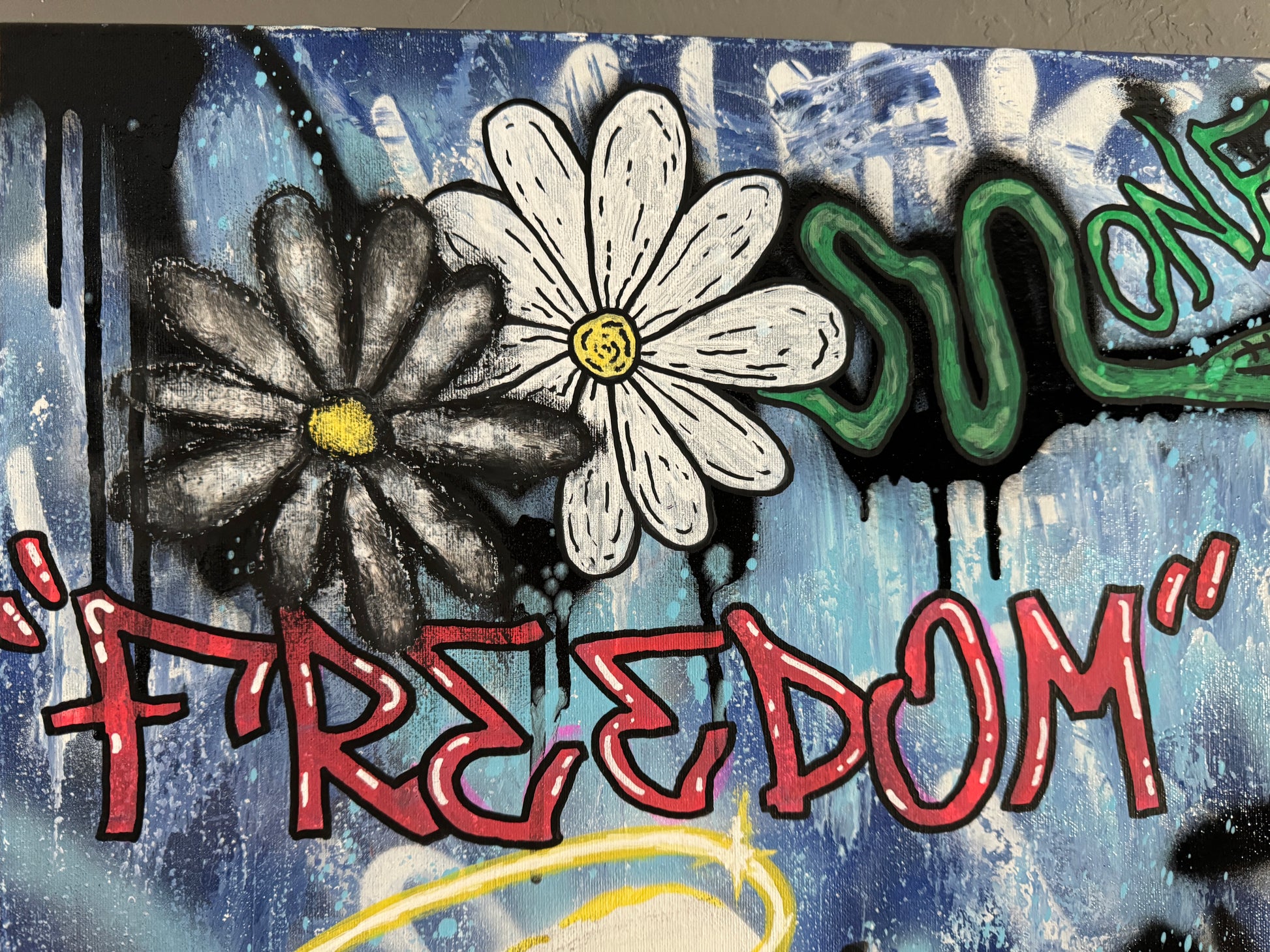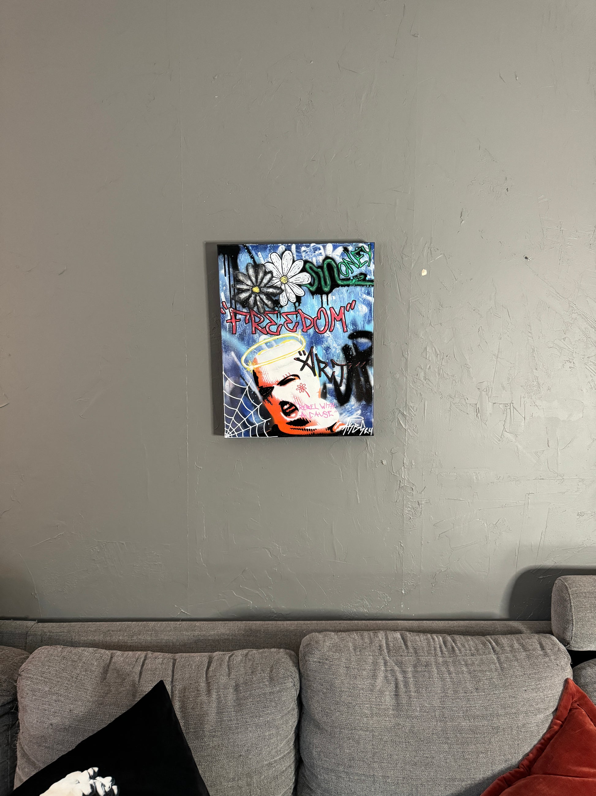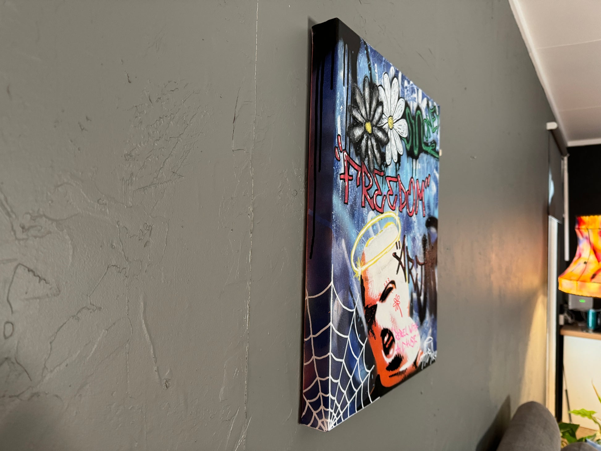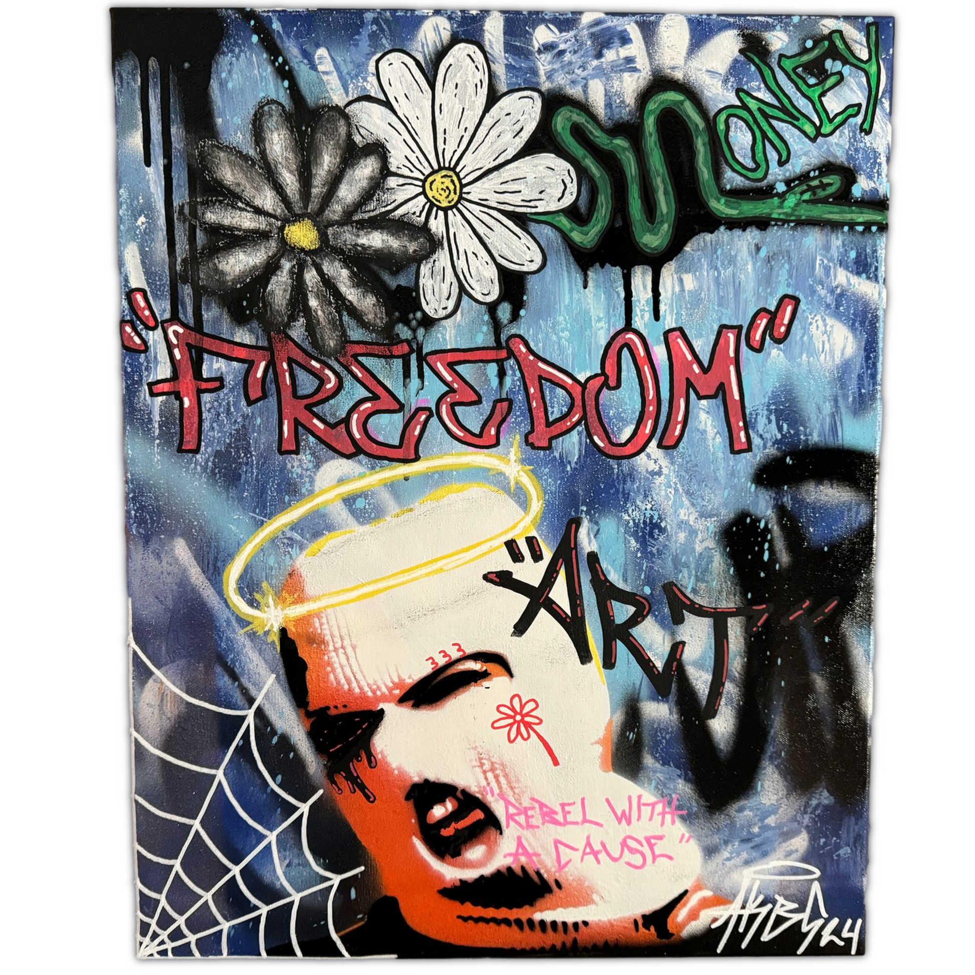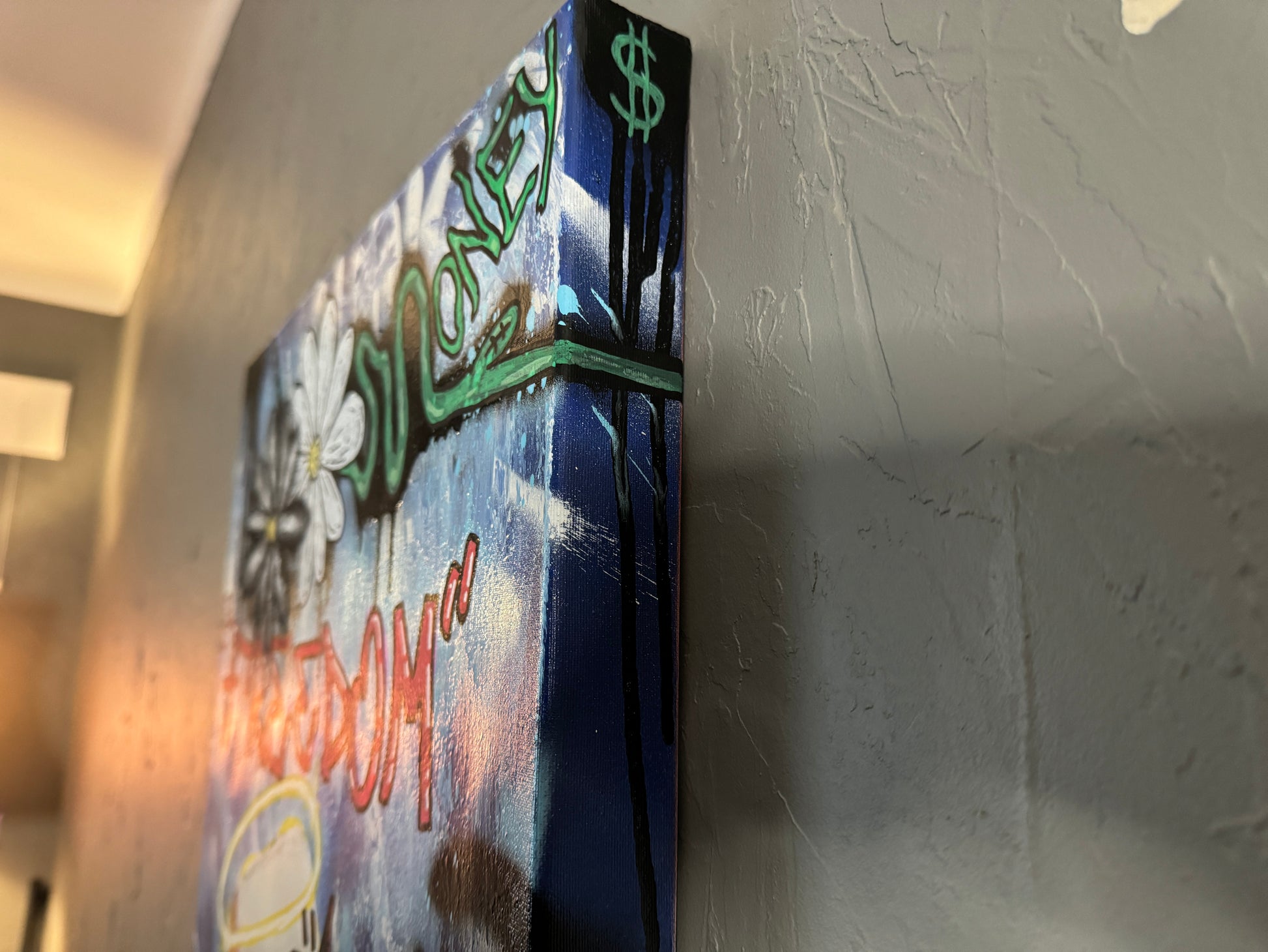 "Money freedom art" er et multi media maleri. Medier brukt er spraylakk, akryltusj, oljestifter og litt kull!