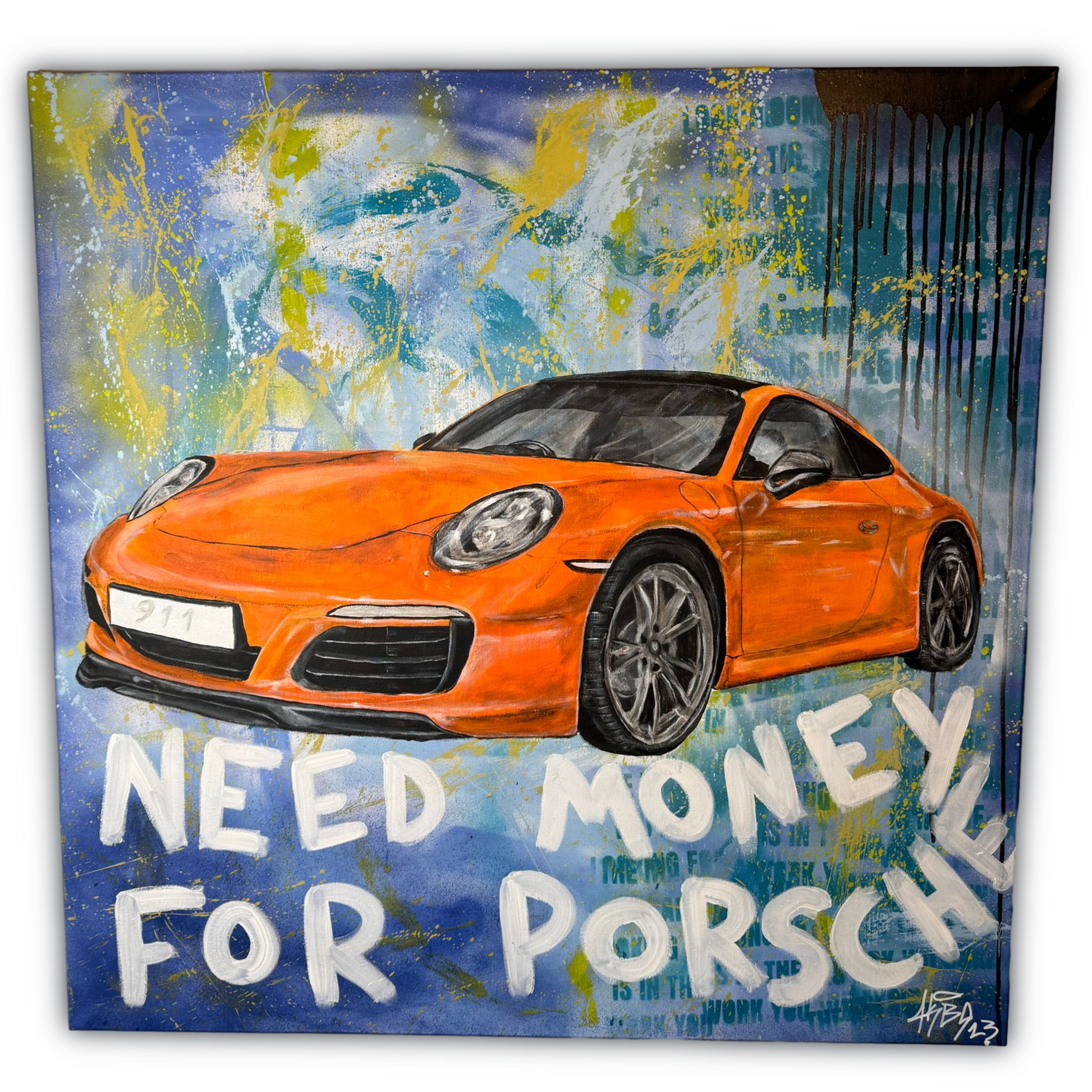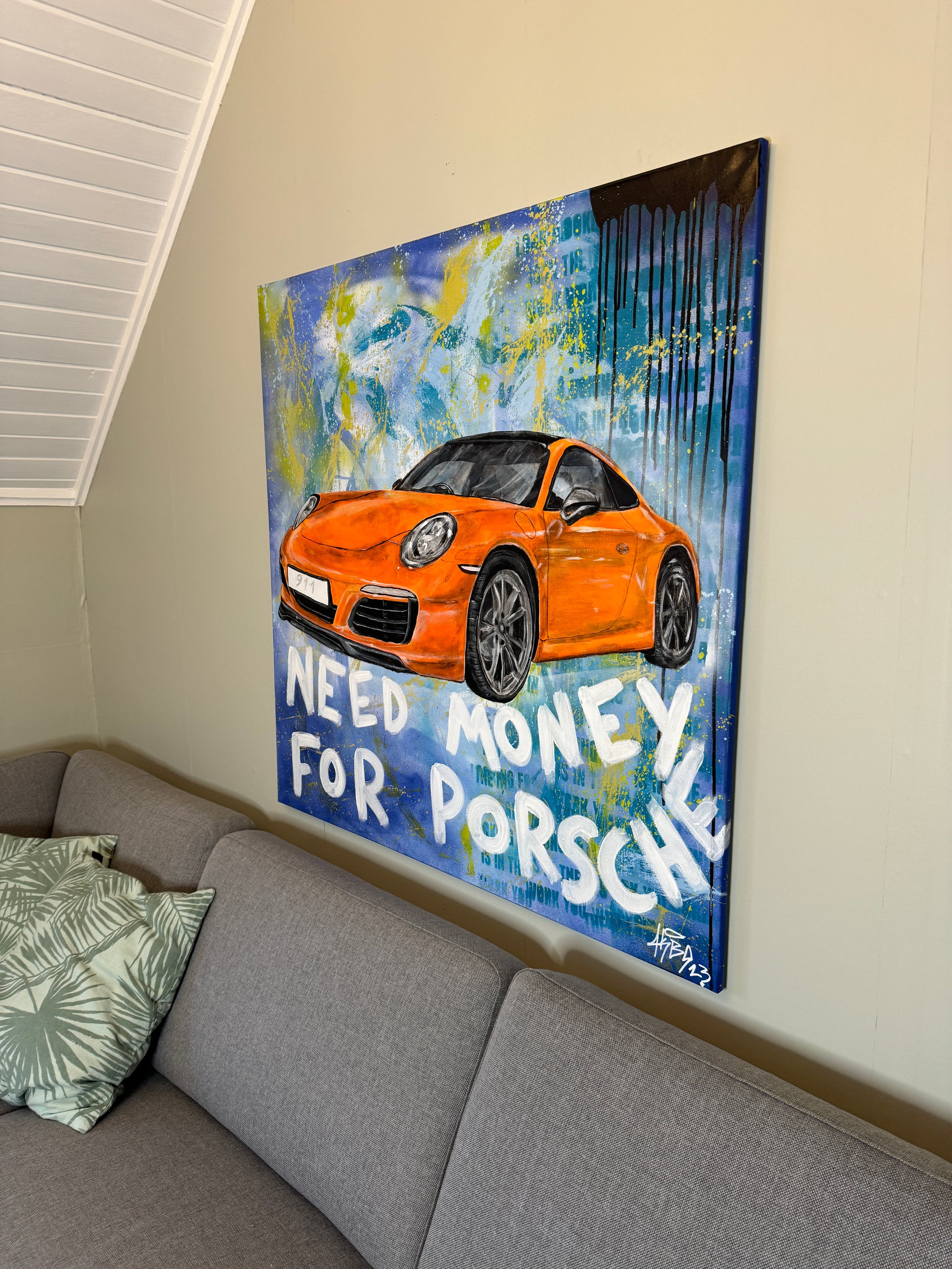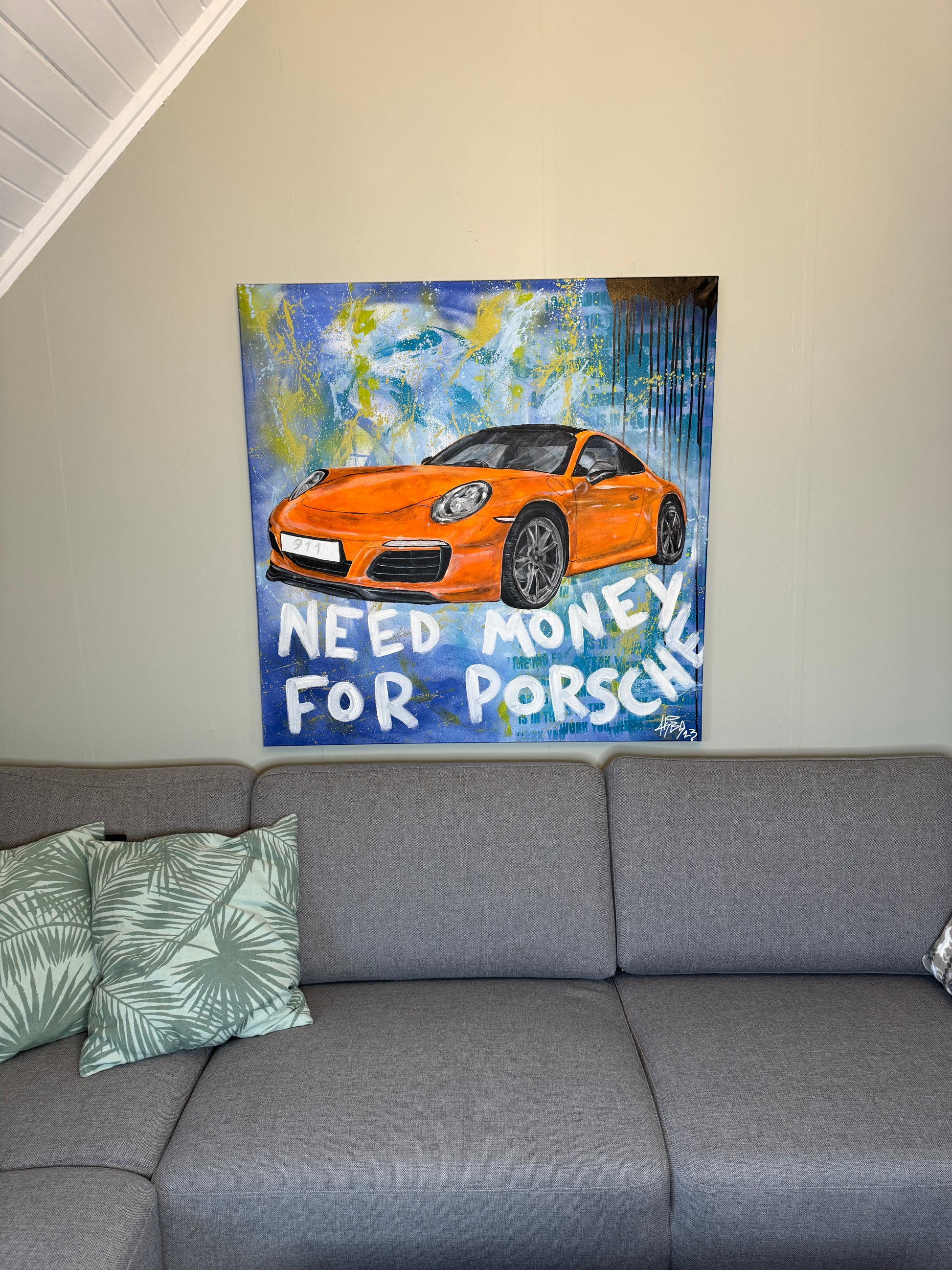 Fresh oransje porsche malt på blå/gul/grønn bakgrunn som passer bra sammen på stort 100x100cm lerret.