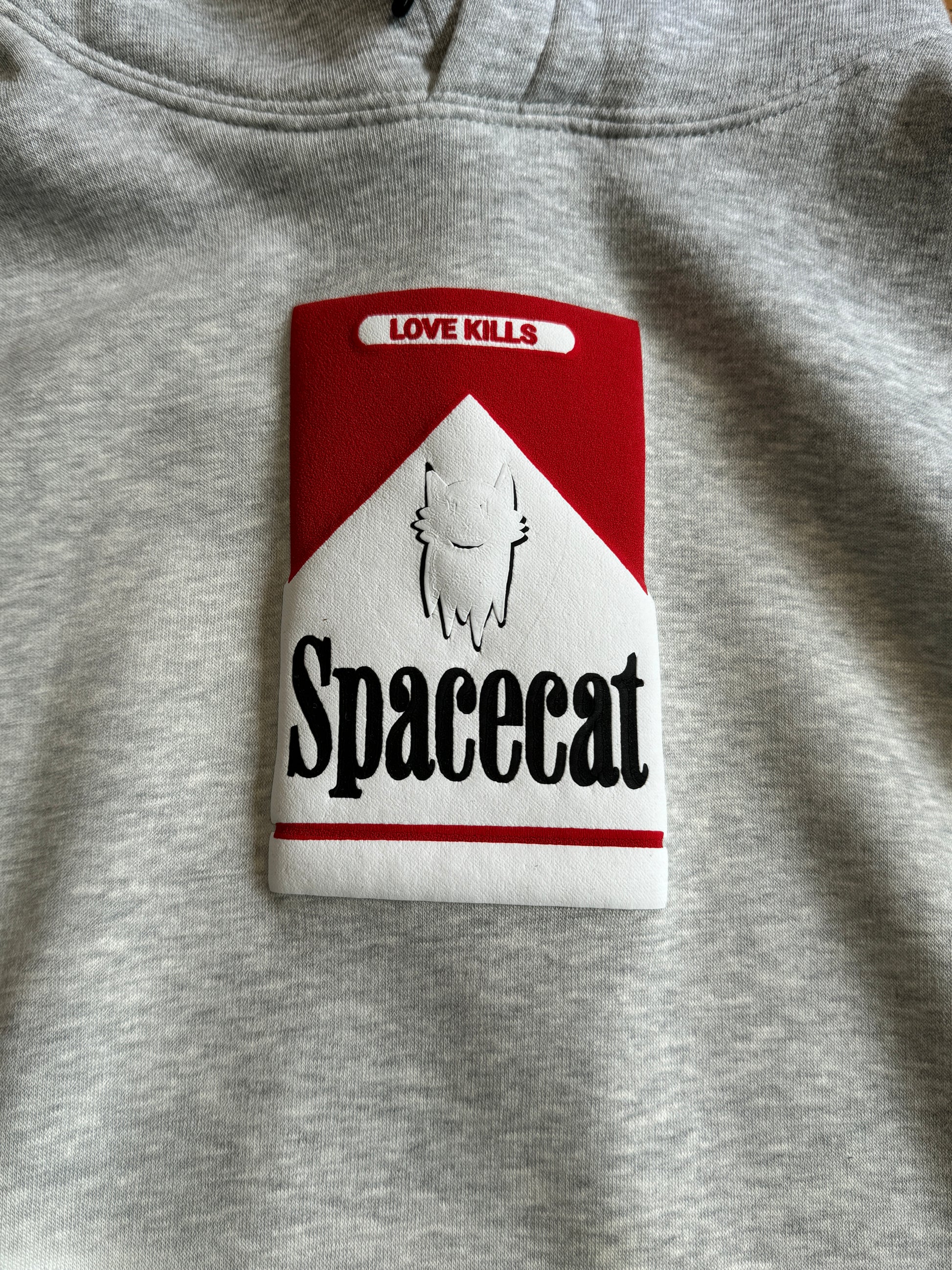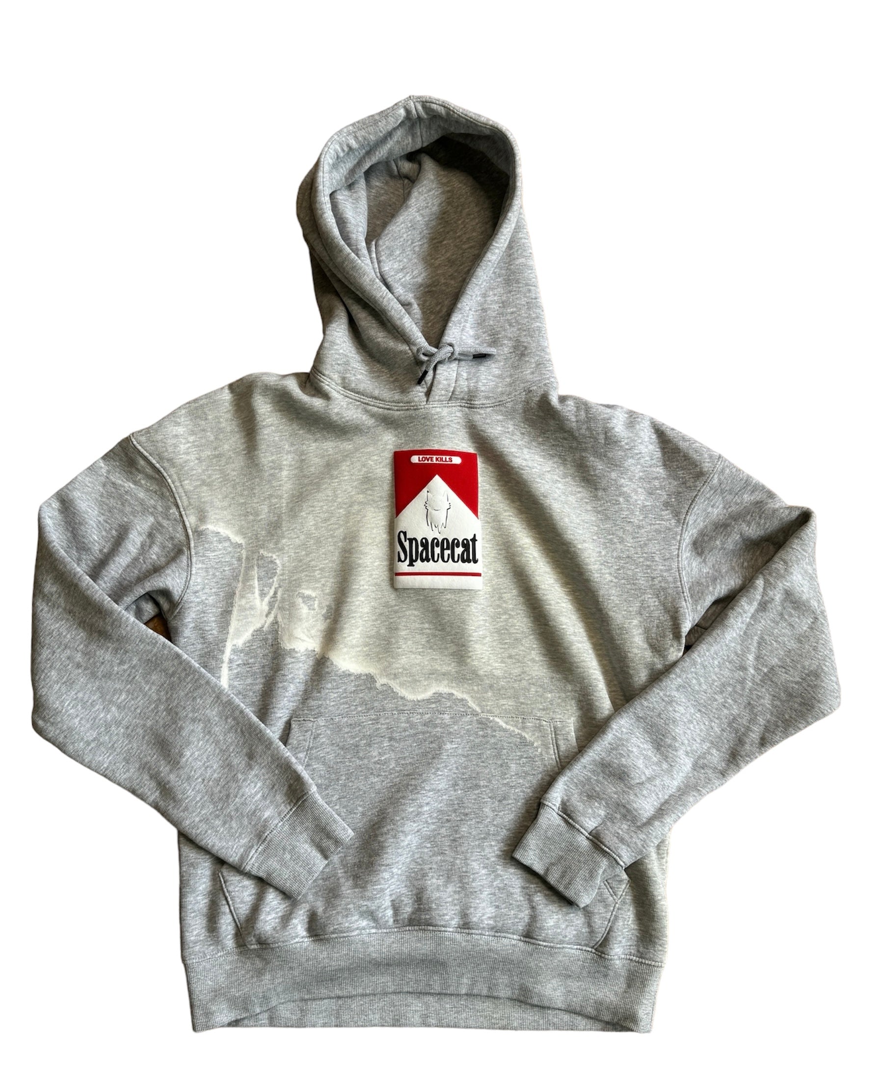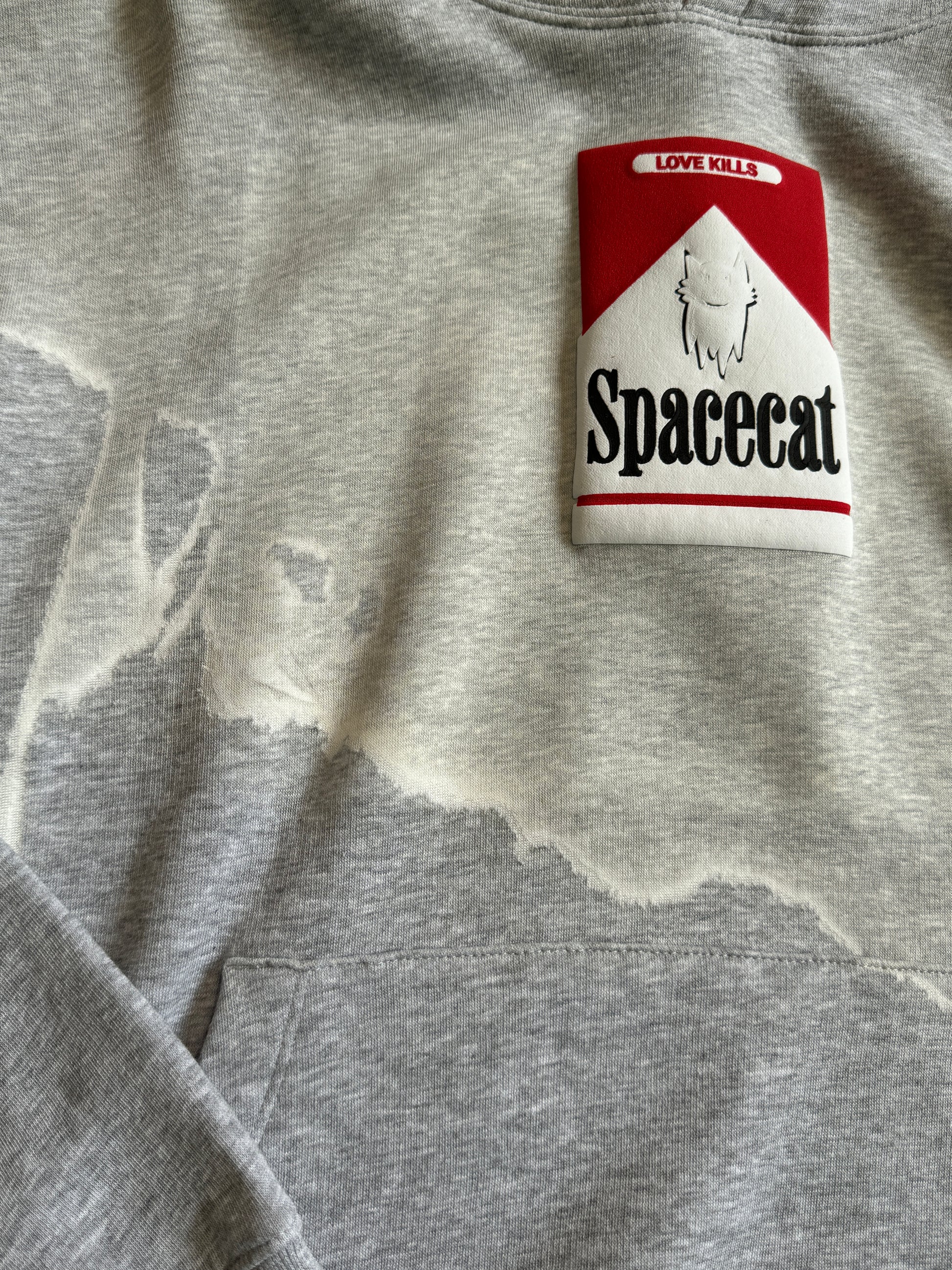 Grå hettegenser med syrevasket mønster av klor. Selges til redusert pris da printen ble feil, men fortsatt helt brukbar og unik!